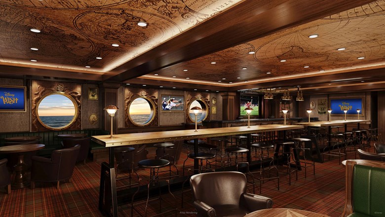 The Keg & Compass pub will be designed in the rustic architectural style of a Norwegian sailor's map room from the late 1800s, Disney said, with inspiration from the folklore of Norse seafaring. Spanning the ceiling will be a fantastical map in old maritime style with an homage to Disney characters and stories related to the sea. The casual setting will have live TV broadcasts and will feature three custom craft brews available exclusively aboard the Wish.